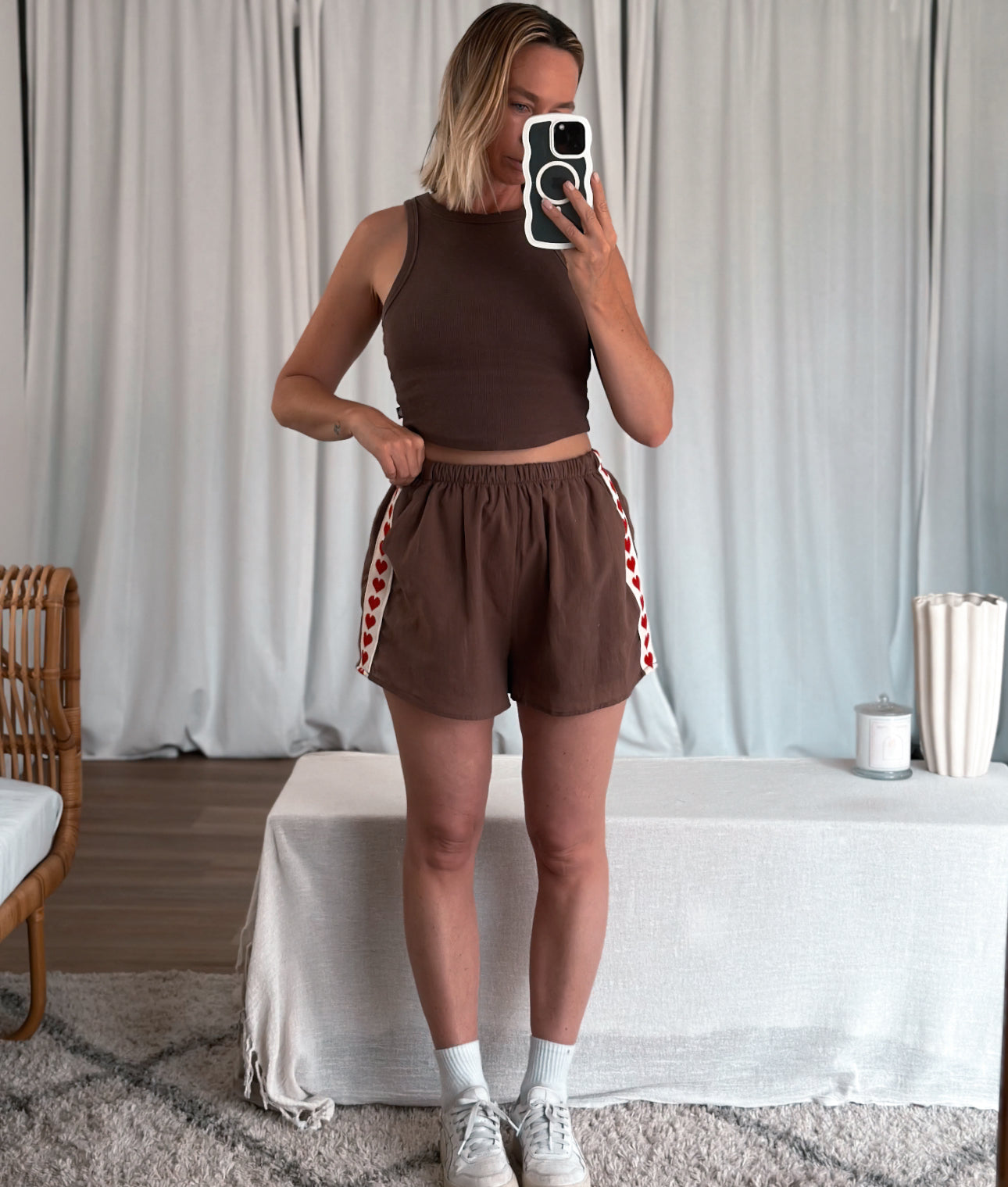 Playful meets effortless in these relaxed-fit lounge shorts, designed for all day comfort with a statement edge. Featuring a soft elasticated waistband and a standout side stripe finished with a bold red heart detailing. Crafted from light weight breathable fabric, cotton, pockets.