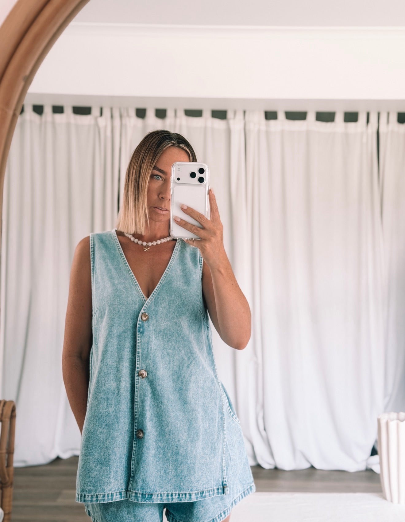 Meet your new throw-on-and-go favourite. The Denim Ease Set features a relaxed sleeveless button-front top paired with easy pull-on shorts, designed for comfort without compromising style. Crafted from soft, lightweight washed denim, this set drapes beautifully and feels effortless on the body.