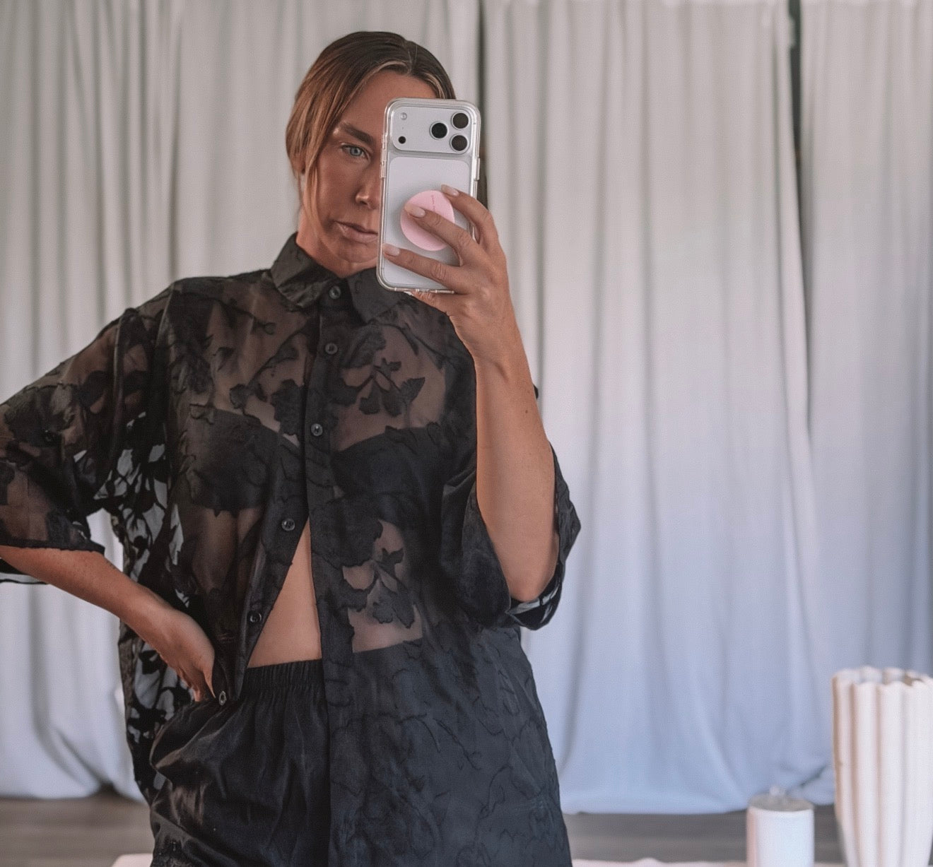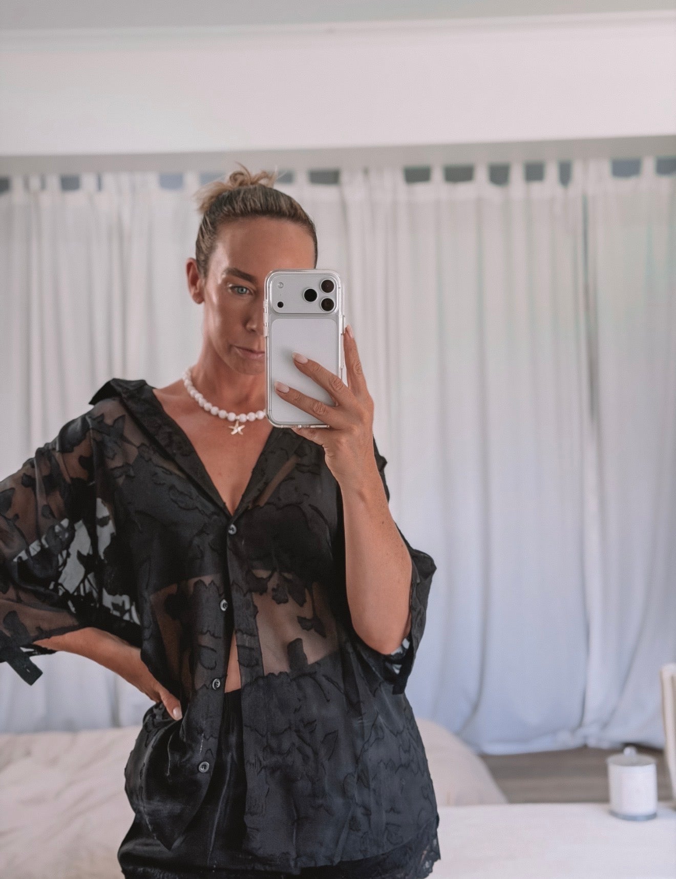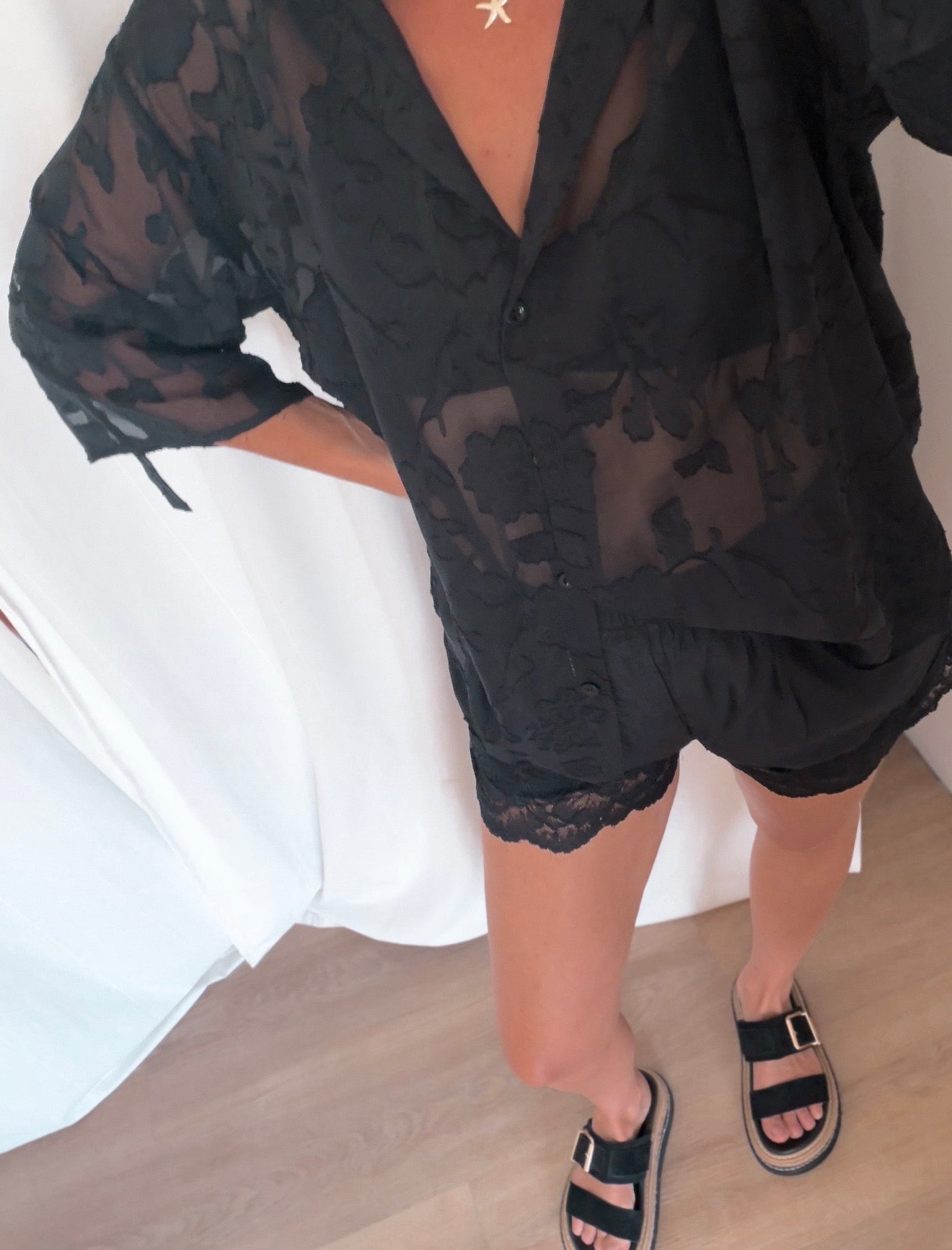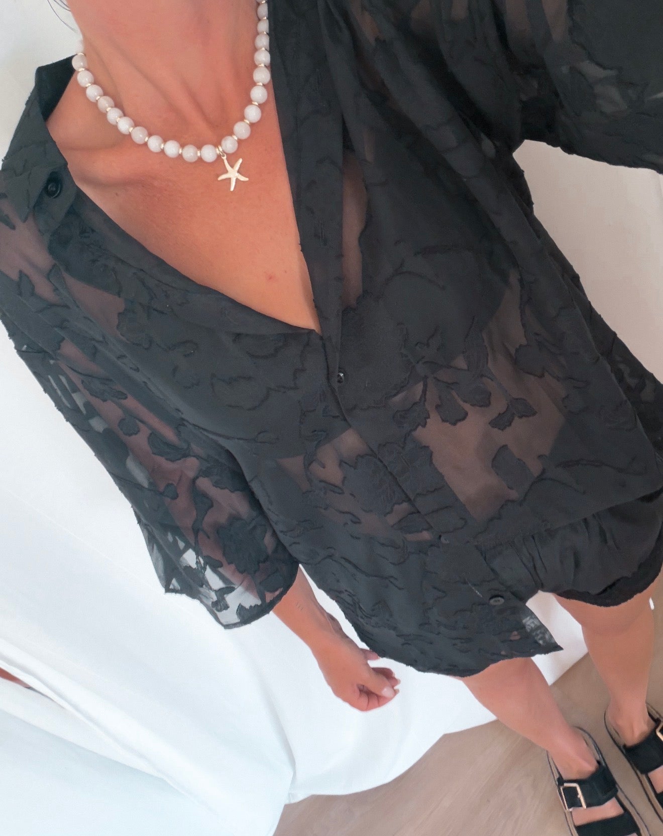 A statement in soft contrast — this sheer black set blends structure with femininity. Featuring a relaxed button-up shirt with delicate tonal floral detailing, paired with matching flowy bottoms, it’s designed to feel both effortless and elevated. Light, breathable and subtly sheer, it layers beautifully while still holding its own as a standout piece.